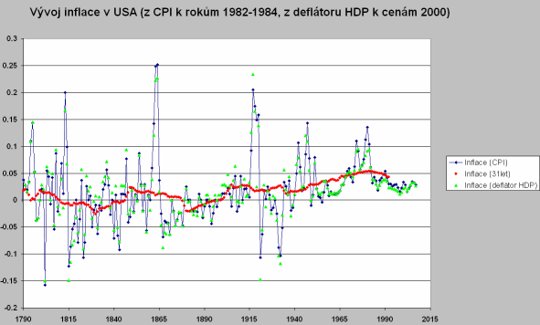 Všimněte si prosím, žže zhruba do konce 1. světové války se střídají období kladné inflace a záporné inflace (deflace). To je ostatně vidět i na průběhu indexu CPI, kde naleznete období, v nichž spotřebitelské ceny klesaly. Aby byla situace ještě patrnější, doplnili jsme do grafu vývoje inflace červenými body i průměry inflace za 31 let (vžždy 15 let před a 15 let poté). Tím jsme se poněkud zbavili „šumu”, který nám jinak brání sledovat základní trendy.