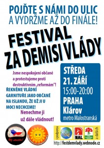 Protože vláda ČR není schopna zastavit rozkrádání státního rozpočtu a navíc s arogancí sobě vlastní pohrdá občany této země, rozhodli jsme se společně svolat na den 21. září 2011 protestní akci pod názvem Festival za demisi vlády, která se uskuteční v Praze na Klárově mezi 15,00 20,00 hod.