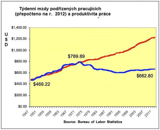 Od roku 1947 do poloviny sedmdesátých let jsme sdíleli poměrně férově plody naší produktivity s pracujícími. Rostla produktivita a rostly i reálné mzdy pracujících (viz dolní čára na grafu) - představuje průměrnou týdenní mzdu podřízených pracujících, kteří tvoří asi 80 % celkových pracovních sil). To nebyl socialismus. Stále jsme měli mnoho bohatých, kteří si brali významný podíl výsledků růstu produktivity). Ale většina tohoto bohatství se vracela zpátky do ekonomiky zdaněním příjmu, které se mezi roky 1947 a 1980 pohybovalo mezi 70 a 91 procenty (!) příjmů, vyšších než 3 miliony dolarů ročně (přepočteno na dnešní hodnotu dolaru). Většina těchto peněz byla použita na vybudování naší dopravní a znalostní infrastruktury a na vítězství ve Studené válce. Odbory byly politicky podporovány a reálné mzdy pracujících plynule rostly i po započtení inflace. Wall Street byl tvrdě kontrolován a střední třídy bohatly jako nikdy dříve.