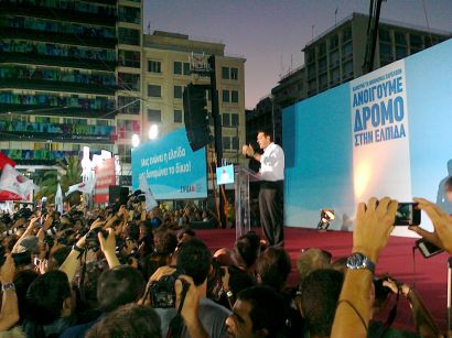Čtvrtek a pátek byly dny posledních veřejných politických mítinků, které byly vysílány po celém Řecku v televizi nebo alespoň v rádiu. První mítink, který jsem navštívil, byla čtvrteční mohutná akce Syrizy v Athénách na náměstí Omonia. V době, kdy se svým projevem vystupoval předseda Koalice radikální levice (SYRIZA) Alexis Tsipras, hovořila ke shromážděným občanům také předsedkyně Komunistické strany Řecka (KKE), ale na jednom náměstí v Soluni. To byla mimochodem první věc, kterou jsem ocenil, že přes veškeré vzájemné výhrady a výpady nebránily obě strany účasti svých voličů na obou shromážděních. V pátek se totiž situace obrátila, takže v Soluni vlály rudo-zeleno-fialové prapory s hvězdou, zatímco v Athénách se shromažďovaly prapory čistě rudé, které tam kontrastovaly s velkou „modrou” manifestací na náměstí Syntagma, kterou svolala pravicová Nová demokracie.