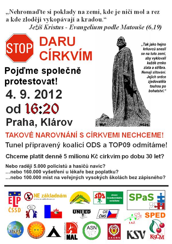 Všechny zveme na protestní shromáždění proti přijetí zákona o vyrovnání s církvemi, k němuž se Poslanecká sněmovna vrátí s největší pravděpodobností 4. září. My půjdeme na Klárov od 16:20. A co vy?